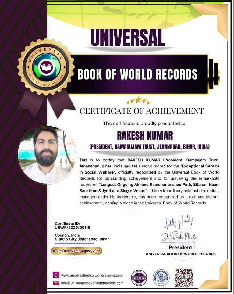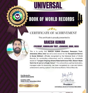This extraordinary spiritual accomplishment has been achieved by Shri Rakesh Kumar (Ramanujam Trust) along with a dedicated group of 62 devotees on 16th July 2025 at the sacred Shri Ramayan Mandir, Jehanabad, Bihar, India.